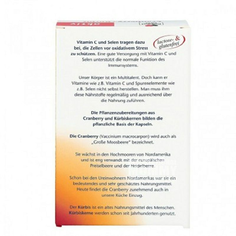 產品參數 主要成分:蔓越莓汁粉300毫克,南瓜籽提取物200毫克,維生素C40毫克,硒15微克。 適用人群:成人 規格:60粒/盒 使用方法:每日2次,每次1粒,溫水送服。 注意事項: 1、本品不宜超過推薦量或與同類營養補充劑同時食用; 2、請勿將其放置在兒童可觸及的地方; 3、請存放於避光、乾燥、不高於25攝氏度的地方; 4、本品為膳食營養補充劑;本品不能代替藥物。 銷售地:Germany 品牌:Doppel herz |