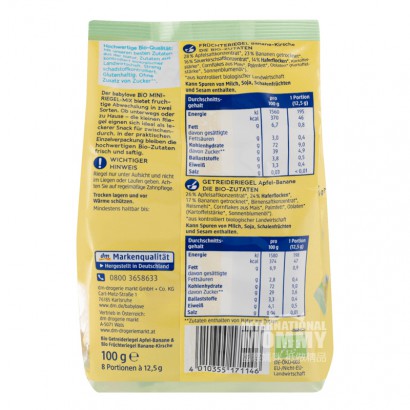 蘋果香蕉成分:26%蘋果汁濃縮物,24%燕麥片,17%香蕉幹燥,濃縮梨汁,米粉,玉米片從玉米,棕櫚脂肪,晶片(馬鈴薯澱粉,向日葵油)。