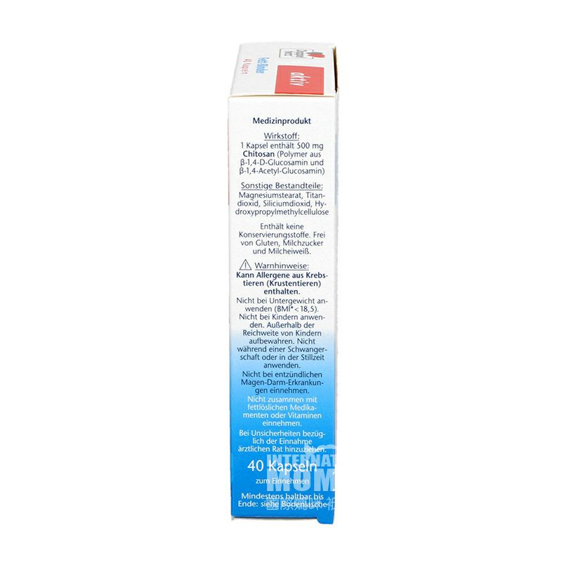 產品特點 1、包含500mg的殼聚醣,利用殼聚醣抑制脂肪酶活性的自然特性。 2、在阻止脂肪吸收的同時將人體血液內的膽固醇排除。 3、能夠有效控制血液中膽固醇含量,保證減少飲食中攝取的脂肪,控制體重,維繫正常健康的生活。 4、減少膳食脂肪的脂肪攝入和卡路里攝入量。 5、不含防腐劑,不含麩質,乳糖和牛奶蛋白質。