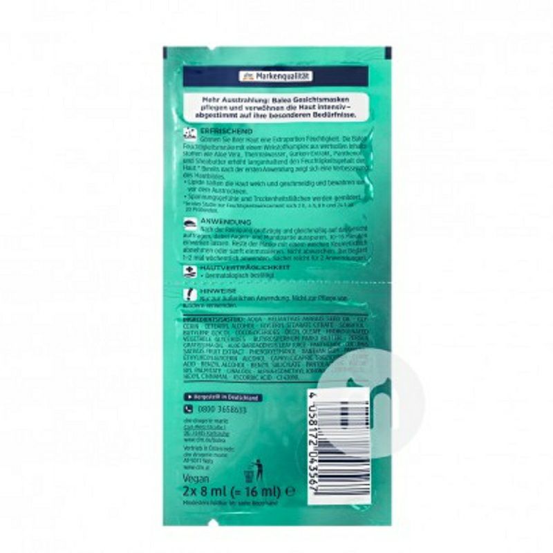Parameters 產品參數 淨含量:2*8ml/件 適用膚質:乾性膚質 使用方法:潔面後,將乳狀面膜均勻敷於面部和頸部,避開眼部,嘴部和唇部肌膚。 10-15分鐘以後,用柔軟的化妝棉輕輕拭去剩餘面膜,免洗式,也可用溫水洗淨,依各人所好。一周使用2-3次,皮膚健康光潔美麗。 注意事項: 1、請勿將其放置在兒童可觸及的地方; 2、請存放於避光、乾燥處; 3、如產品不慎入眼,請立即用大量清水沖洗乾淨。 銷售地:Germany 品牌:Balea |