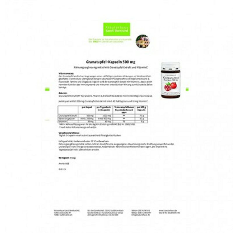 產品參數 成分:石榴提取物(77%),明膠,維生素C,玉米澱粉填充劑,硬脂酸鎂脫模劑。 適用人群:成人 規格:90粒 使用方法:每日2粒。 注意事項: 1、營養品不能代替均衡的飲食及健康的生活方式。 2、儲存時避免陽光直曬。 3、本產品不用於診斷病症,診療或預防任何病症。 銷售地:Germany 品牌:Sanct Bernhard |