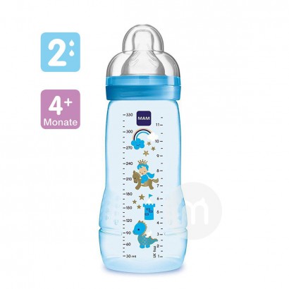 Features 產品特點 1.奶瓶可分拆彻底清洗,无需奶瓶刷,既方便又卫生 2.防滑设计易于婴儿抓握 3.防漏帽,卫生,方便外出携带 4.反绞痛阀奶嘴,MAM奶瓶的使用有利于从母乳喂养过度到奶瓶,并允许混合喂养 5.奶嘴根据妈妈乳头的形状和触感设计,给宝宝犹如母乳喂养般的享受 6.奶嘴特殊的缓流设计,更符合宝宝的吸允节奏,使宝宝进食更为舒适 7.设计纹路不会造成宝宝吸奶时小嘴疼痛,避免宝宝吸允过程中奶嘴堵塞 8.宽口的设计方便放奶粉和清洗,宽环在喂奶时拧紧,不会出现任何泄漏 9.清透瓶身,背后刻度清晰,更加便捷精准的冲灌奶粉 10.蓝色舒适手柄,方便宝宝抓握