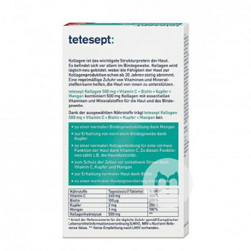 產品參數 成分:膠原蛋白水解物(44.5%); 填料:微晶纖維素; 抗壞血酸(維生素C,21.3%); 包衣劑:羥丙基甲基纖維素; 分離劑:脂肪酸的鎂鹽; 硫酸錳( 0.56%); 硫酸銅(0.45%); 脫模劑:滑石粉; 包衣劑:羥丙基纖維素; 染料:二氧化鈦,氧化鐵紅; 植物油(椰子); 生物素(0.009%)。 適合人群:成年女性 規格:30片/盒 服用方法:每天1片, 溫水服用。 注意事項: 1、請勿將其放置在兒童不可觸及的地方. 2、請存放於避光、乾燥處,25℃以下保存。 銷售地:Germany 品牌:tetesept |