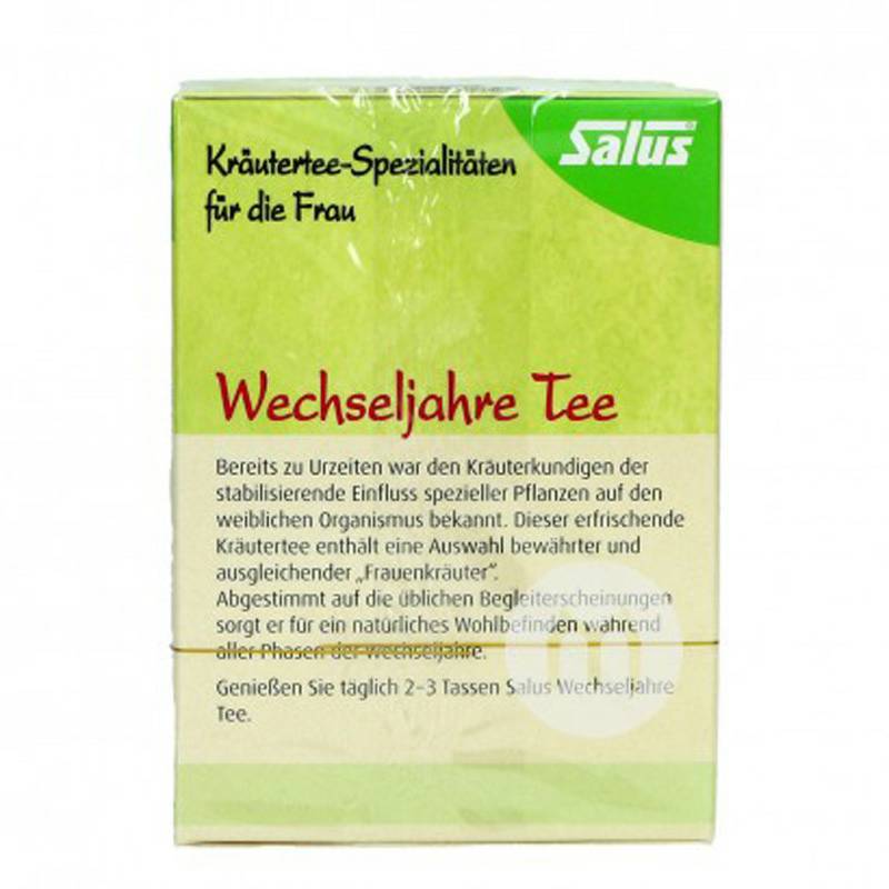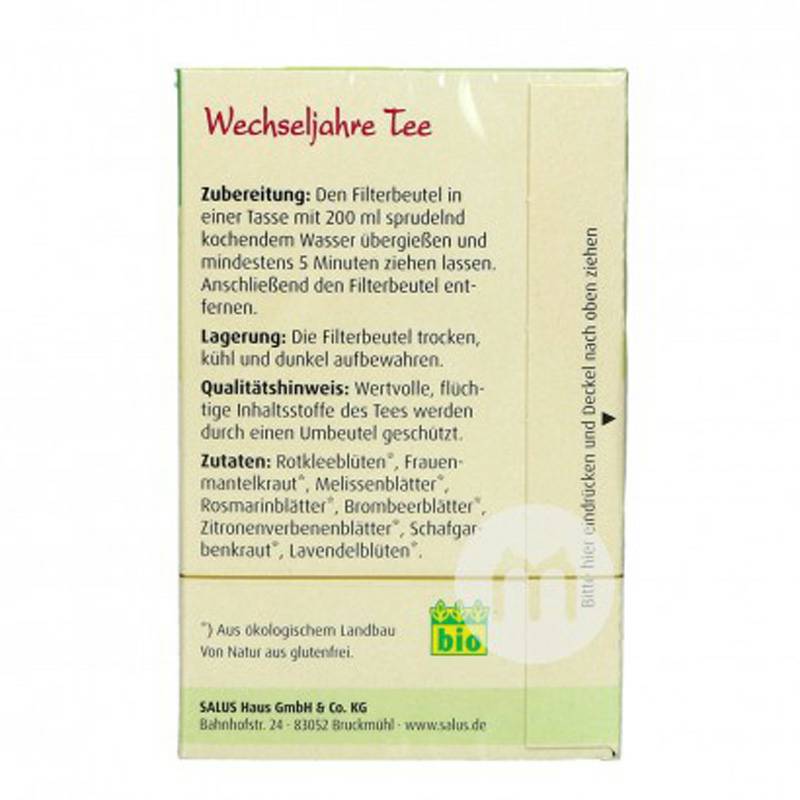 Parameters 產品參數 成分:紅三葉草*,夫人的地幔藥草*,檸檬香脂葉*,迷迭香葉*,黑莓葉*,檸檬馬鞭草葉*,蓍草*,薰衣草花*。 規格:15包*1.8g 適用人群:女性 食用用法:將茶包放入200ml沸水中,靜置5分鐘即可飲用。 注意事項: 1、請勿將其放置在兒童不可觸及的地方。 2、請存放於避光、乾燥處,25℃以下保存。 3、懷孕、哺乳期婦女或正在服用其它藥物,服用前請先諮詢醫生。 銷售地:Germany 品牌:Salus |