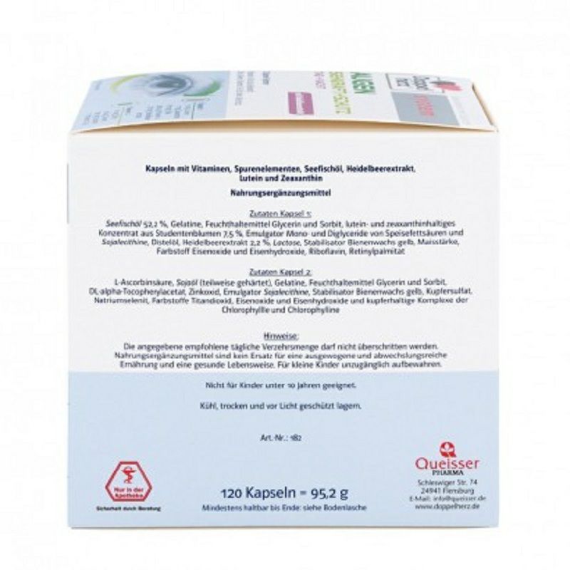 產品參數 主要成分:維生素,微量元素,海魚油,藍莓提取物,葉黃素和玉米黃質。過敏原包含:大豆,魚,牛奶。 適用人群:成人 規格:120粒/盒 使用方法:每日服用兩粒,兩種不同成分的膠囊各一粒,溫水送服。 注意事項: 1、本品不宜超過推薦量或與同類營養補充劑同時食用; 2、請勿將其放置在兒童可觸及的地方,不適合兒童和青少年; 3、請存放於避光、乾燥、不高於25攝氏度的地方; 4、本品為膳食營養補充劑;本品不能代替藥物。 銷售地:Germany 品牌:Doppel herz |